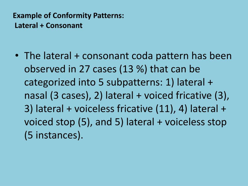 Example of Conformity Patterns: Lateral + Consonant • The lateral + consonant coda pattern has been observed in 27 cases (13 %) that can be categorized into 5 subpatterns: 1) lateral + nasal (3 cases), 2) lateral + voiced fricative (3), 3) lateral + voiceless fricative (11), 4) lateral + voiced stop (5), and 5) lateral + voiceless stop (5 instances).