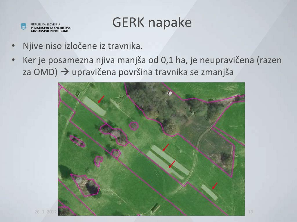 GERK napake • GERK ne odraža dejanskega stanja v naravi • Ni aplikacijske kontrole za meje med kmetijskimi rabami (KZU) • Na nekmetijsko (neKZU) rabo opozarja aplikacija