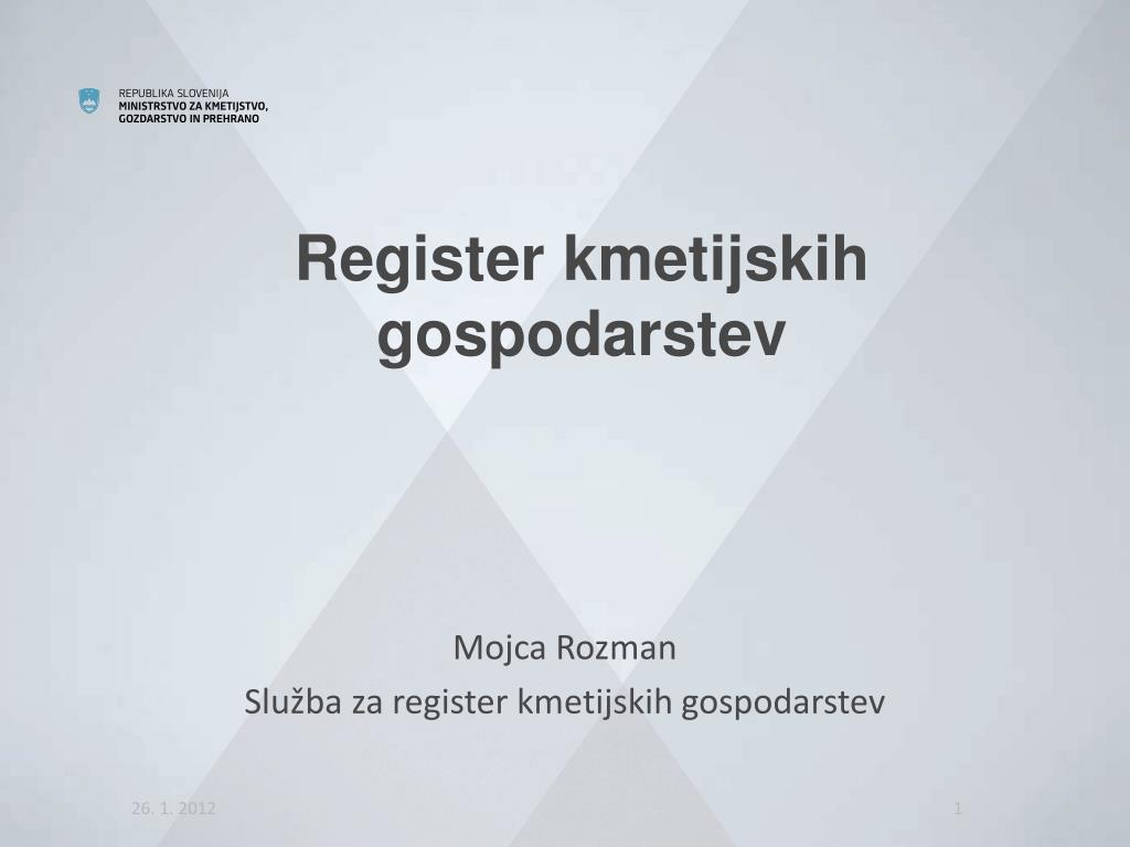 Register kmetijskih gospodarstev Mojca Rozman Služba za register kmetijskih gospodarstev