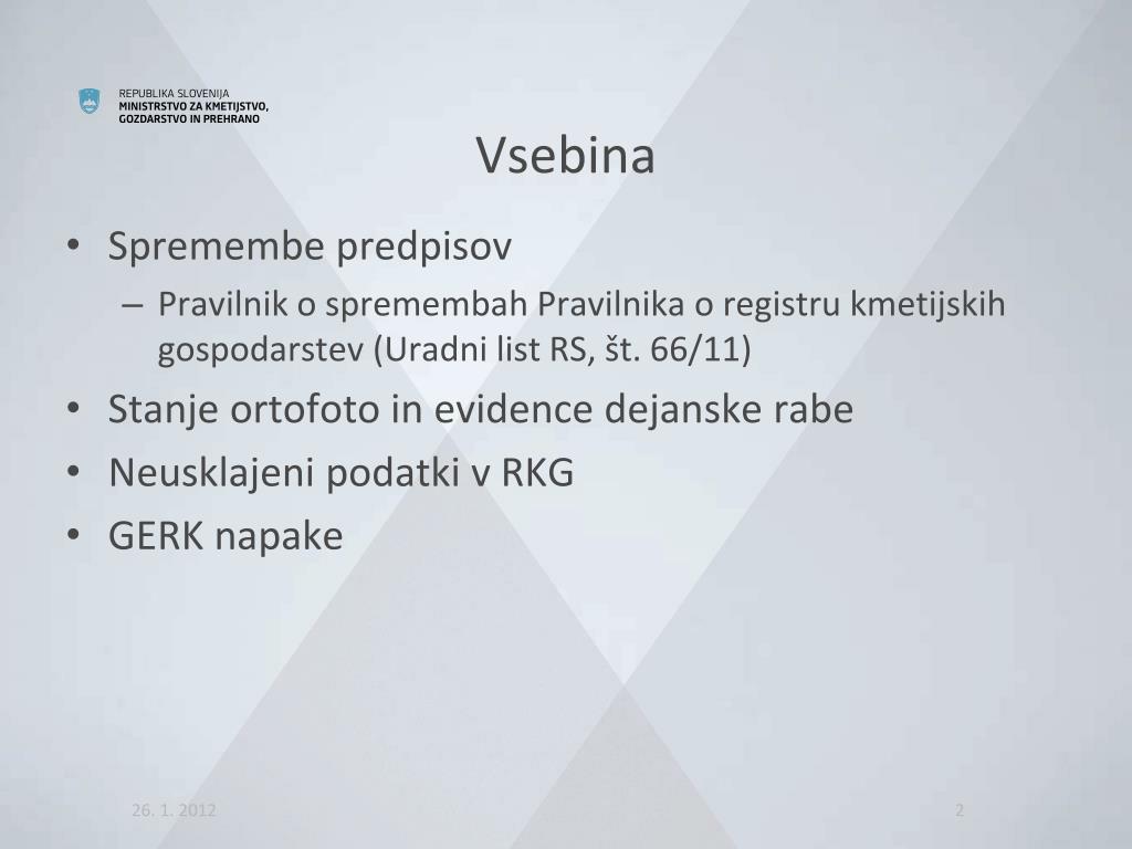 Vsebina • Spremembe predpisov • Pravilnik o spremembah Pravilnika o registru kmetijskih gospodarstev (Uradni list RS, št. 66/11) • Stanje ortofoto in evidence dejanske rabe • Neusklajeni podatki v RKG • GERK napake