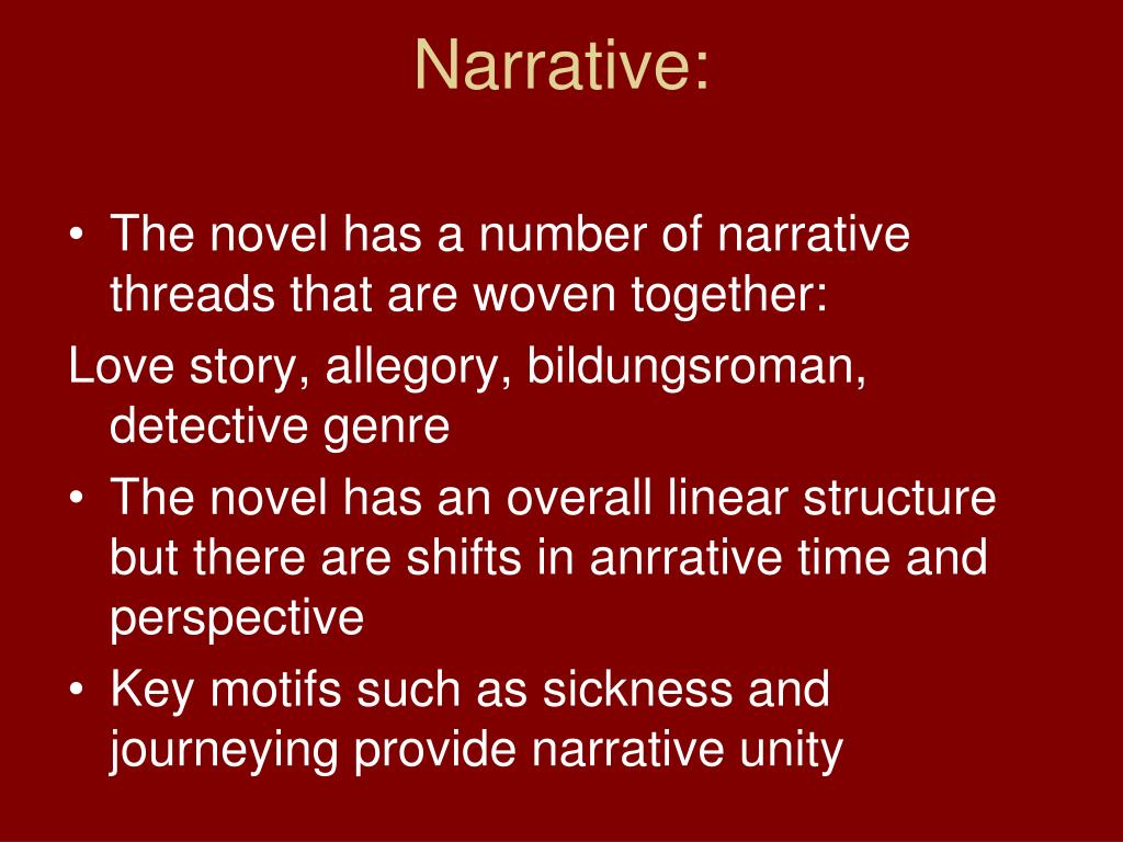 Narrative: • The novel has a number of narrative threads that are woven together: Love story, allegory, bildungsroman, detective genre • The novel has an overall linear structure but there are shifts in anrrative time and perspective • Key motifs such as sickness and journeying provide narrative unity