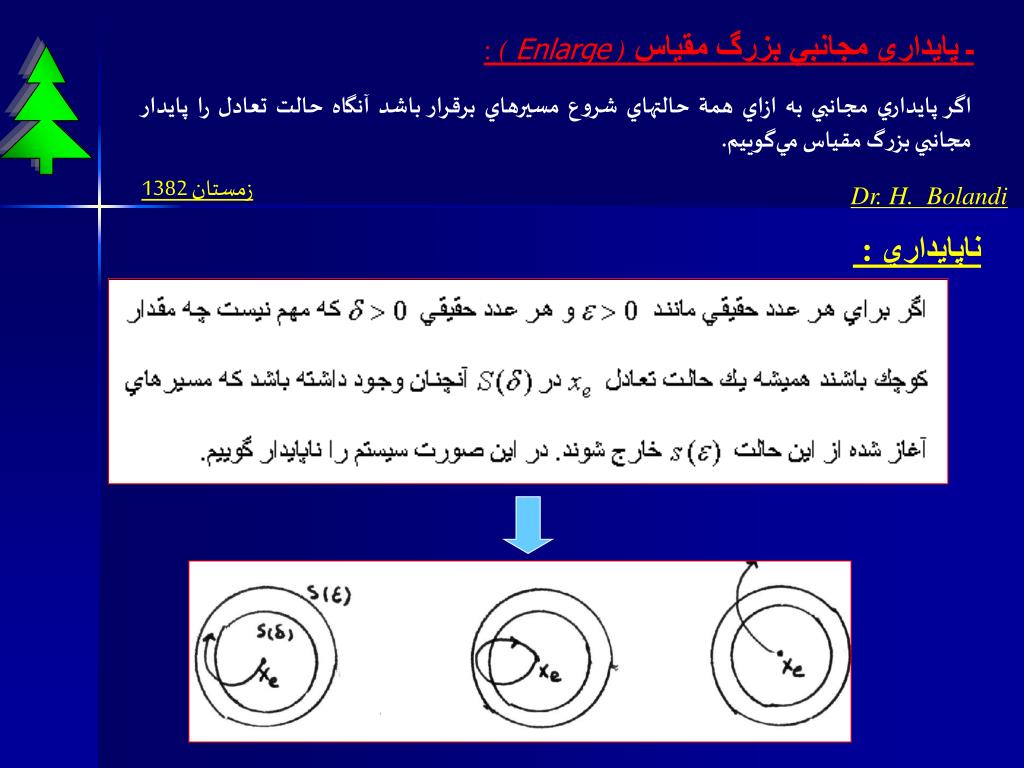 ـ پايداري مجانبي بزرگ مقياس( Enlarge(: اگر پايداري مجانبي به ازاي همة حالتهاي شروع مسيرهاي برقرار باشد آنگاه حالت تعادل را پايدار مجانبي بزرگ مقياس ميگوييم. زمستان 1382 Dr. H. Bolandi ناپايداري :