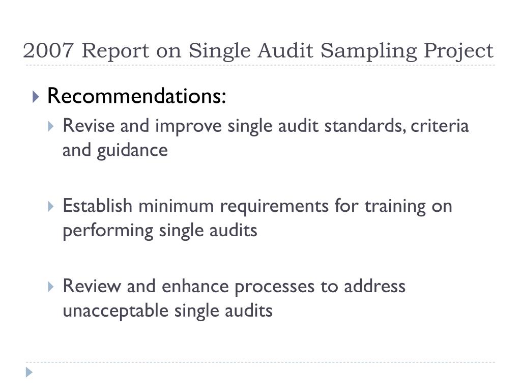 2007 Report on Single Audit Sampling Project • Recommendations: • Revise and improve single audit standards, criteria and guidance • Establish minimum requirements for training on performing single audits • Review and enhance processes to address unacceptable single audits