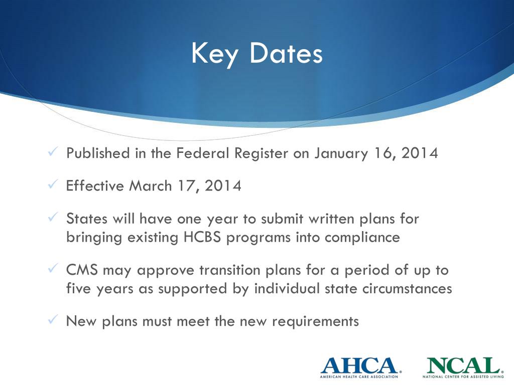 Published in the Federal Register on January 16, 2014 Effective March 17, 2014 States will have one year to submit written plans for bringing existing HCBS programs into compliance CMS may approve transition plans for a period of up to five years as supported by individual state circumstances New plans must meet the new requirements Key Dates