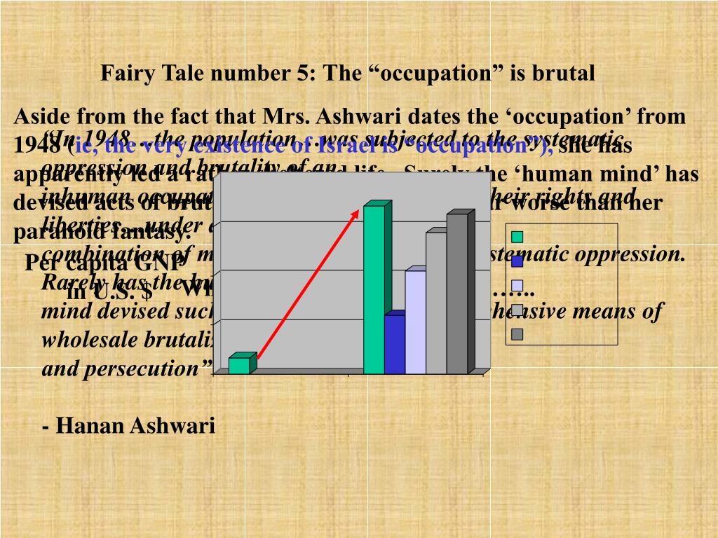 Fairy Tale number 5: The “occupation” is brutal Aside from the fact that Mrs. Ashwari dates the ‘occupation’ from 1948 (ie, the very existence of Israel is “occupation”), she has apparently led a rather sheltered life. Surely the ‘human mind’ has devised acts of brutalization and persecution far worse than her paranoid fantasy. Which brings us to……………….. “In 1948…the population…was subjected to the systematic oppression and brutality of an inhuman occupation that robbed them of all their rights and liberties…under a unique combination of military occupation…..and systematic oppression. Rarely has the human mind devised such varied, diverse and comprehensive means of wholesale brutalization and persecution” - Hanan Ashwari Per capita GNP in U.S. $