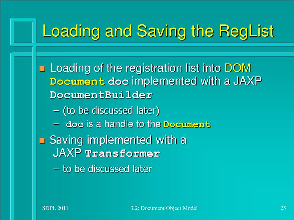 Loading and Saving the RegList • Loading of the registration list into DOMDocumentdoc implemented with a JAXP DocumentBuilder • (to be discussed later) • doc is a handle to the Document • Saving implemented with a JAXP Transformer • to be discussed later 3.2: Document Object Model