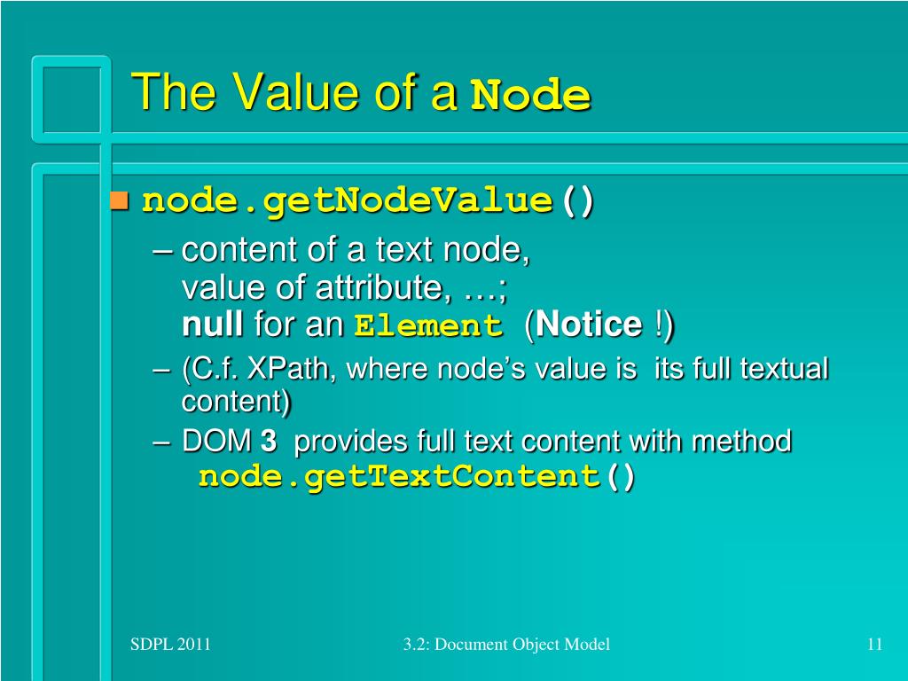The Value of aNode • node.getNodeValue() • content of a text node, value of attribute, …; null for an Element(Notice !) • (C.f. XPath, where node’s value is its full textual content) • DOM 3 provides full text content with methodnode.getTextContent() 3.2: Document Object Model