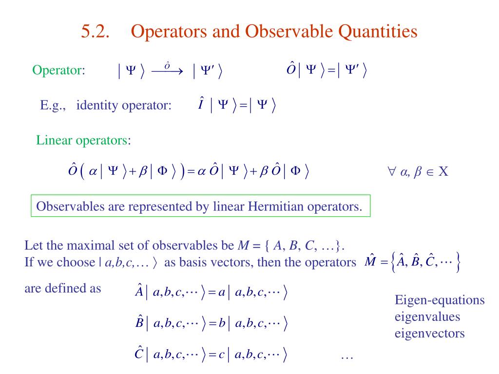 5.2. Operators and Observable Quantities Operator: E.g., identity operator: Linear operators: α, β C Observables are represented by linear Hermitian operators. Let the maximal set of observables be M = { A, B, C, …}. If we choose | a,b,c,… as basis vectors, then the operators are defined as Eigen-equations eigenvalues eigenvectors …