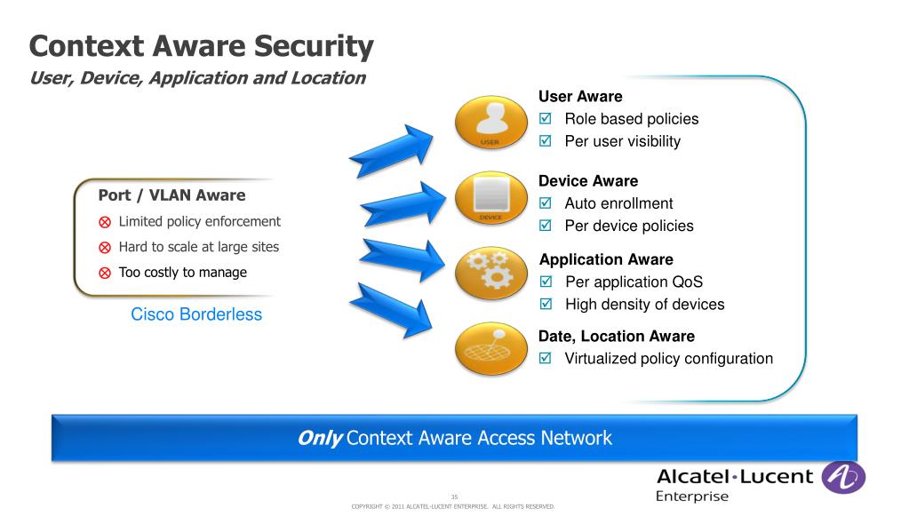Port / VLAN Aware ⊗ Limited policy enforcement ⊗ Hard to scale at large sites ⊗ Too costly to manage Context Aware SecurityUser, Device, Application and Location User Aware • Role based policies • Per user visibility Device Aware • Auto enrollment • Per device policies Application Aware • Per application QoS • High density of devices Cisco Borderless Date, Location Aware • Virtualized policy configuration Only Context Aware Access Network