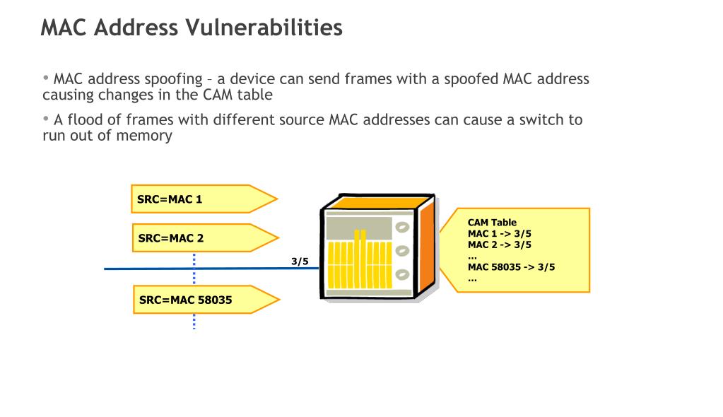 SRC=MAC 1 CAM Table MAC 1 -> 3/5 MAC 2 -> 3/5 … MAC 58035 -> 3/5 … SRC=MAC 2 3/5 SRC=MAC 58035 MAC Address Vulnerabilities • MAC address spoofing – a device can send frames with a spoofed MAC address causing changes in the CAM table • A flood of frames with different source MAC addresses can cause a switch to run out of memory