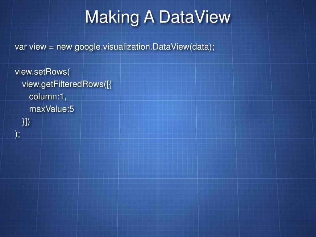 Making A DataView • var view = new google.visualization.DataView(data); • view.setRows( • view.getFilteredRows([{ • column:1, • maxValue:5 • }]) • );