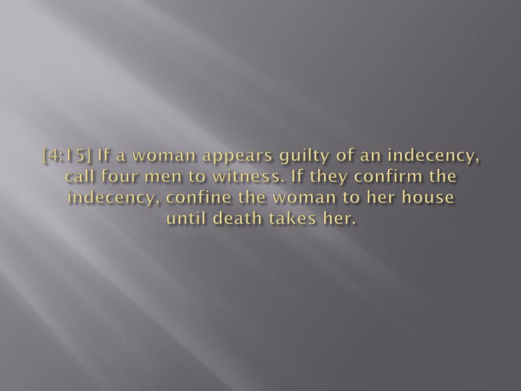 [4:15] If a woman appears guilty of an indecency,call four men to witness. If they confirm theindecency, confine the woman to her houseuntil death takes her.