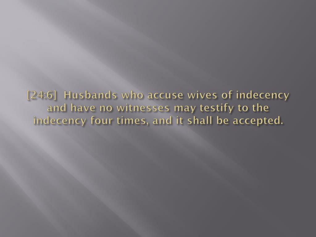 [24:6] Husbands who accuse wives of indecencyand have no witnesses may testify to theindecency four times, and it shall be accepted.