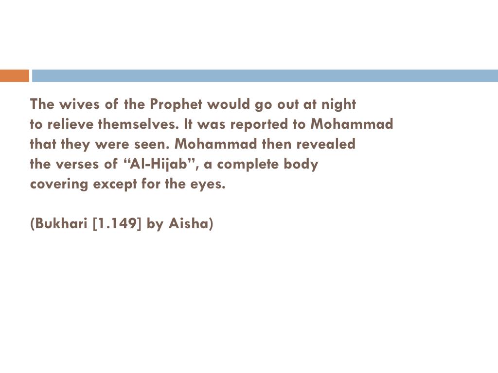 The wives of the Prophet would go out at nightto relieve themselves. It was reported to Mohammad that they were seen. Mohammad then revealedthe verses of “Al-Hijab”, a complete bodycovering except for the eyes.(Bukhari [1.149] by Aisha)