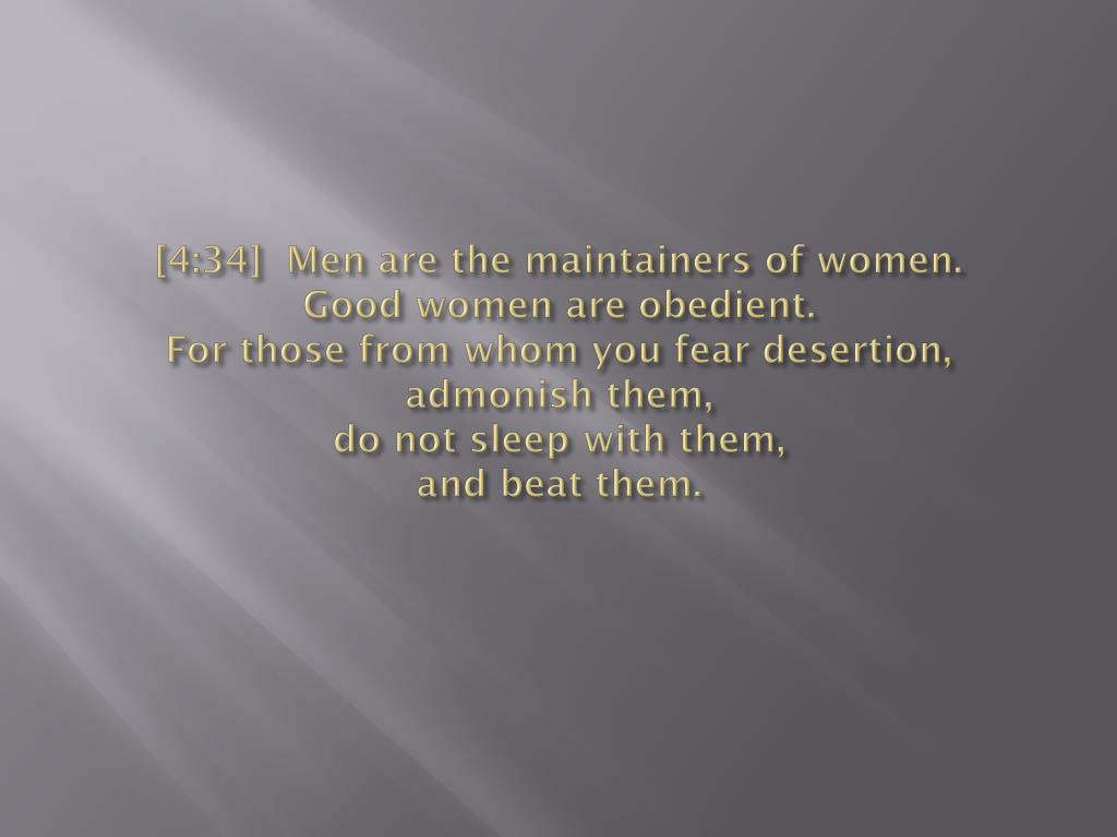 [4:34] Men are the maintainers of women.Good women are obedient. For those from whom you fear desertion, admonish them, do not sleep with them, and beat them.
