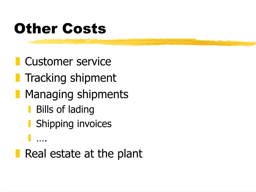 Other Costs • Customer service • Tracking shipment • Managing shipments • Bills of lading • Shipping invoices • …. • Real estate at the plant