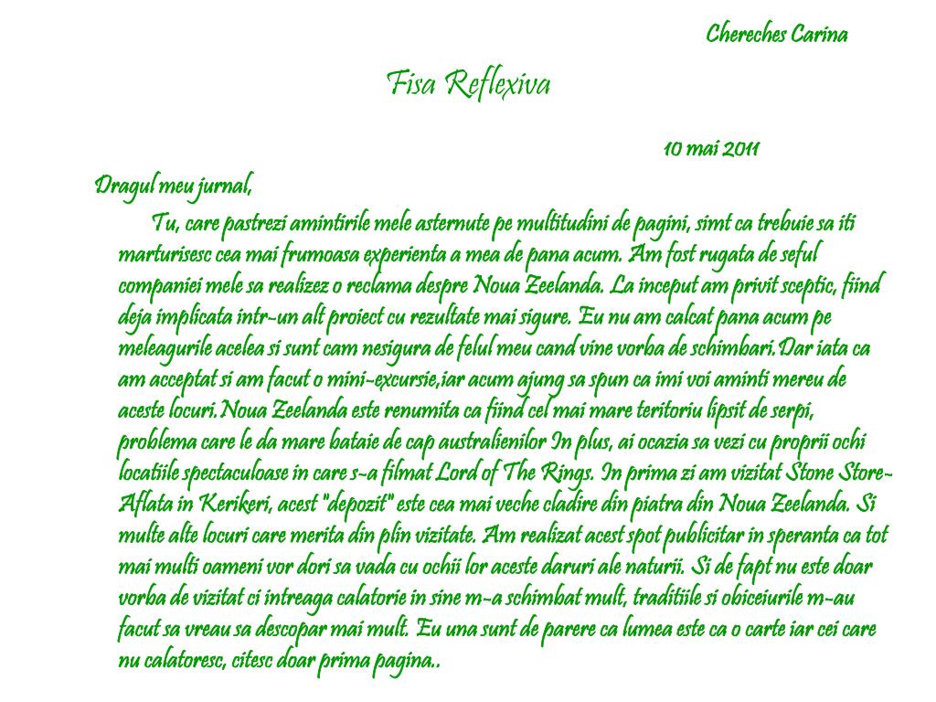 Chereches Carina Fisa Reflexiva 10 mai 2011 Dragul meu jurnal, Tu, care pastrezi amintirile mele asternute pe multitudini de pagini, simt ca trebuie sa iti marturisesc cea mai frumoasa experienta a mea de pana acum. Am fost rugata de seful companiei mele sa realizez o reclama despre Noua Zeelanda. La inceput am privit sceptic, fiind deja implicata intr-un alt proiect cu rezultate mai sigure. Eu nu am calcat pana acum pe meleagurile acelea si sunt cam nesigura de felul meu cand vine vorba de schimbari.Dar iata ca am acceptat si am facut o mini-excursie,iar acum ajung sa spun ca imi voi aminti mereu de aceste locuri.Noua Zeelanda este renumita ca fiind cel mai mare teritoriu lipsit de serpi, problema care le da mare bataie de cap australienilor In plus, ai ocazia sa vezi cu proprii ochi locatiile spectaculoase in care s-a filmat Lord of The Rings. In prima zi am vizitat Stone Store-Aflata in Kerikeri, acest "depozit" este cea mai veche cladire din piatra din Noua Zeelanda. Si multe alte locuri care merita din plin vizitate. Am realizat acest spot publicitar in speranta ca tot mai multi oameni vor dori sa vada cu ochii lor aceste daruri ale naturii. Si de fapt nu este doar vorba de vizitat ci intreaga calatorie in sine m-a schimbat mult, traditiile si obiceiurile m-au facut sa vreau sa descopar mai mult. Eu una sunt de parere ca lumea este ca o carte iar cei care nu calatoresc, citesc doar prima pagina..
