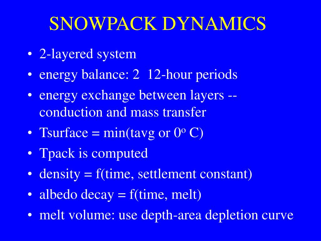 SNOWPACK DYNAMICS • 2-layered system • energy balance: 2 12-hour periods • energy exchange between layers -- conduction and mass transfer • Tsurface = min(tavg or 0o C) • Tpack is computed • density = f(time, settlement constant) • albedo decay = f(time, melt) • melt volume: use depth-area depletion curve