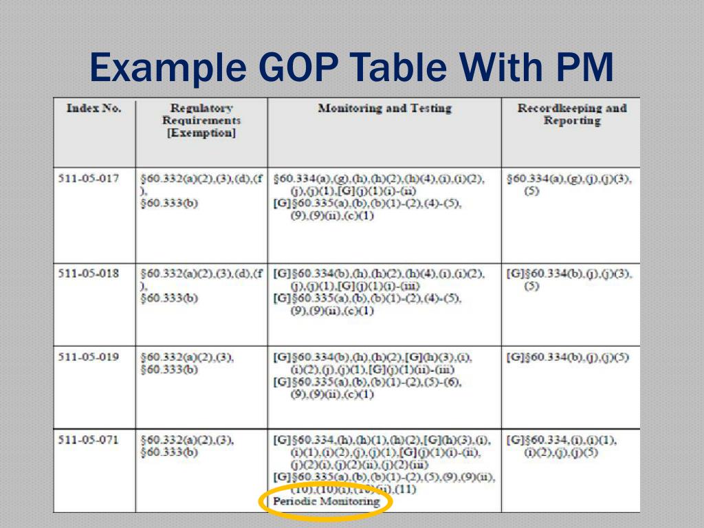 Compliance Assurance Monitoring/Periodic Monitoring Compliance Assurance Monitoring (CAM) • Is in section (d) of the GOP • Has applicability criteria • May be required for standard permits or permits by rule Periodic Monitoring (PM) • In section (f) of the GOP • Has applicability criteria • May be indicated in the tables • CAM • PM • Section (d) of GOP • Section (f) of GOP • Applicability Criteria • Applicability Criteria • Standard Permits and PBRs • Indicated in Tables