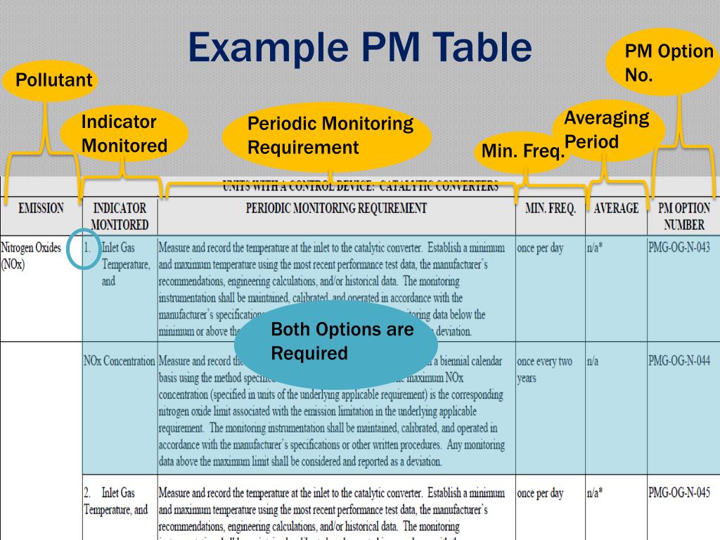 Example PM Table PM Option No. Pollutant Averaging Period Indicator Monitored Periodic Monitoring Requirement Min. Freq. Both Options are Required