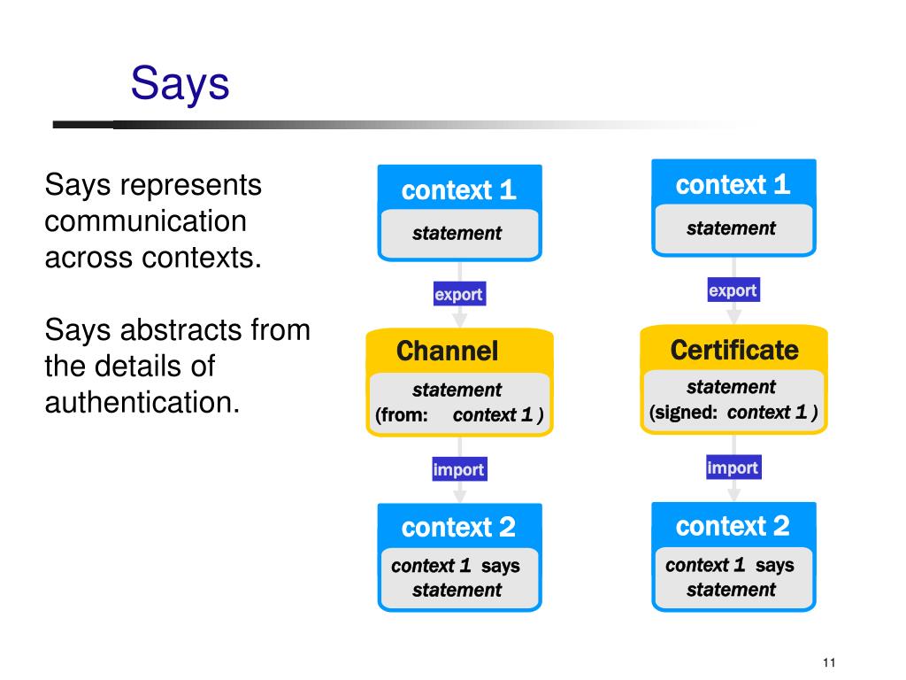 context 1 context 1 statement statement export export Certificate statement (signed: context 1 ) import import context 2 context 2 context 1 context 1 says says statement statement Says Says represents communication across contexts. Says abstracts from the details of authentication. Channel statement (from: context 1 )