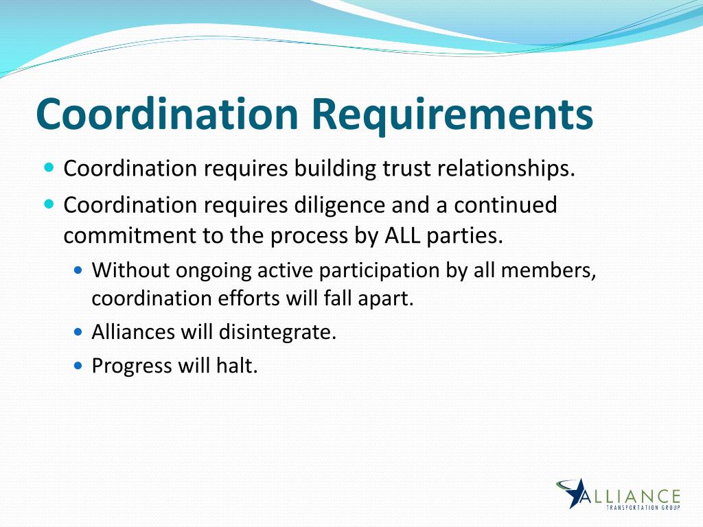 Coordination Requirements • Coordination requires building trust relationships. • Coordination requires diligence and a continued commitment to the process by ALL parties. • Without ongoing active participation by all members, coordination efforts will fall apart. • Alliances will disintegrate. • Progress will halt.
