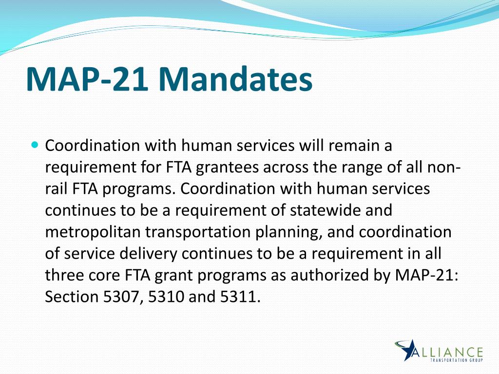 MAP-21Mandates • Coordination with human services will remain a requirement for FTA grantees across the range of all non-rail FTA programs. Coordination with human services continues to be a requirement of statewide and metropolitan transportation planning, and coordination of service delivery continues to be a requirement in all three core FTA grant programs as authorized by MAP-21: Section 5307, 5310 and 5311.