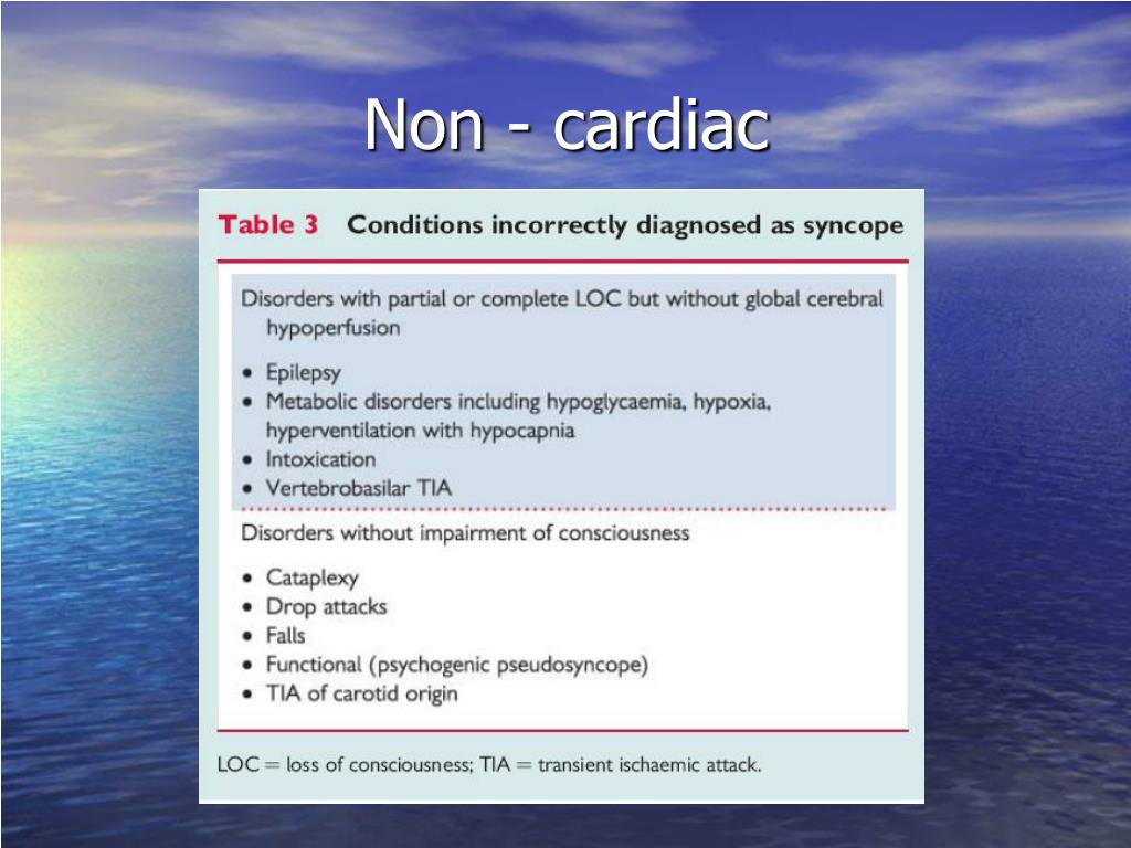 Important causes of cardiac syncope - “Red Flags” - Palpitations • Severe SOB • Severe Chest Pain • Syncope / near syncope