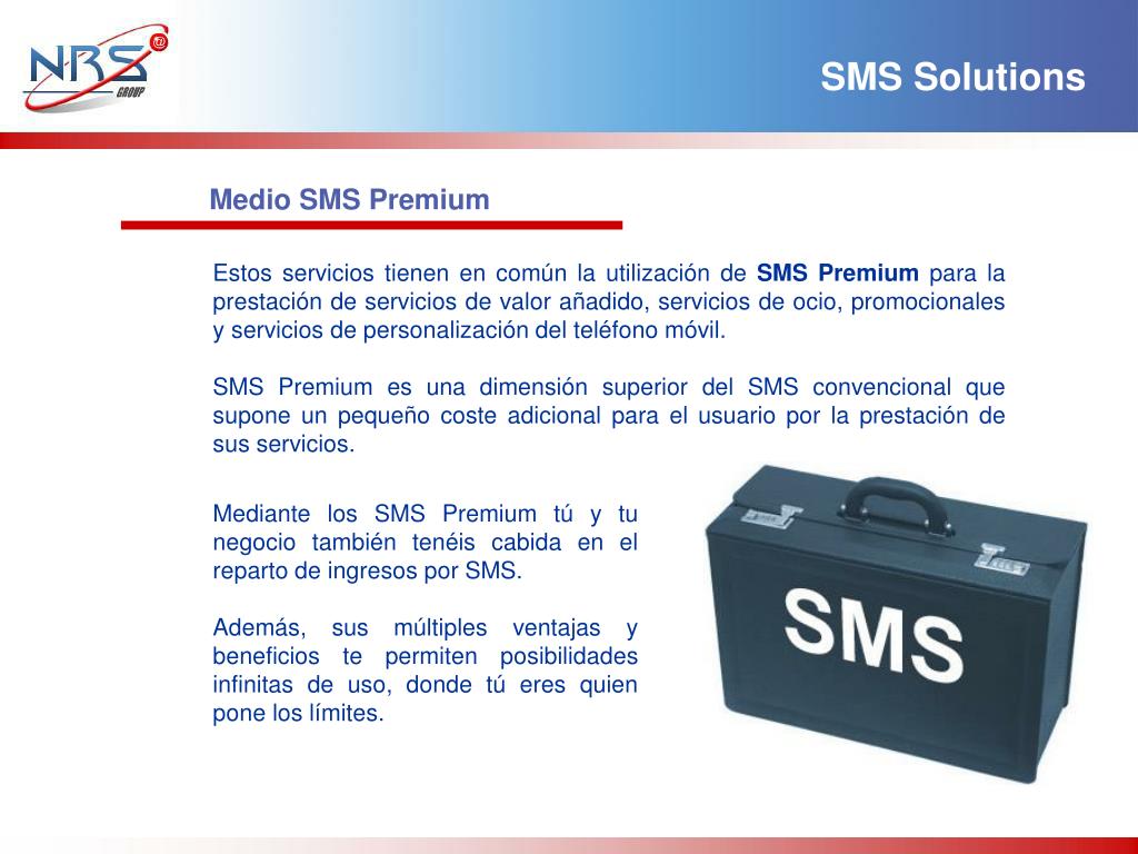 SMS Solutions Medio SMS Premium Estos servicios tienen en común la utilización de SMS Premium para la prestación de servicios de valor añadido, servicios de ocio, promocionales y servicios de personalización del teléfono móvil. SMS Premium es una dimensión superior del SMS convencional que supone un pequeño coste adicional para el usuario por la prestación de sus servicios. Mediante los SMS Premium tú y tu negocio también tenéis cabida en el reparto de ingresos por SMS. Además, sus múltiples ventajas y beneficios te permiten posibilidades infinitas de uso, donde tú eres quien pone los límites.
