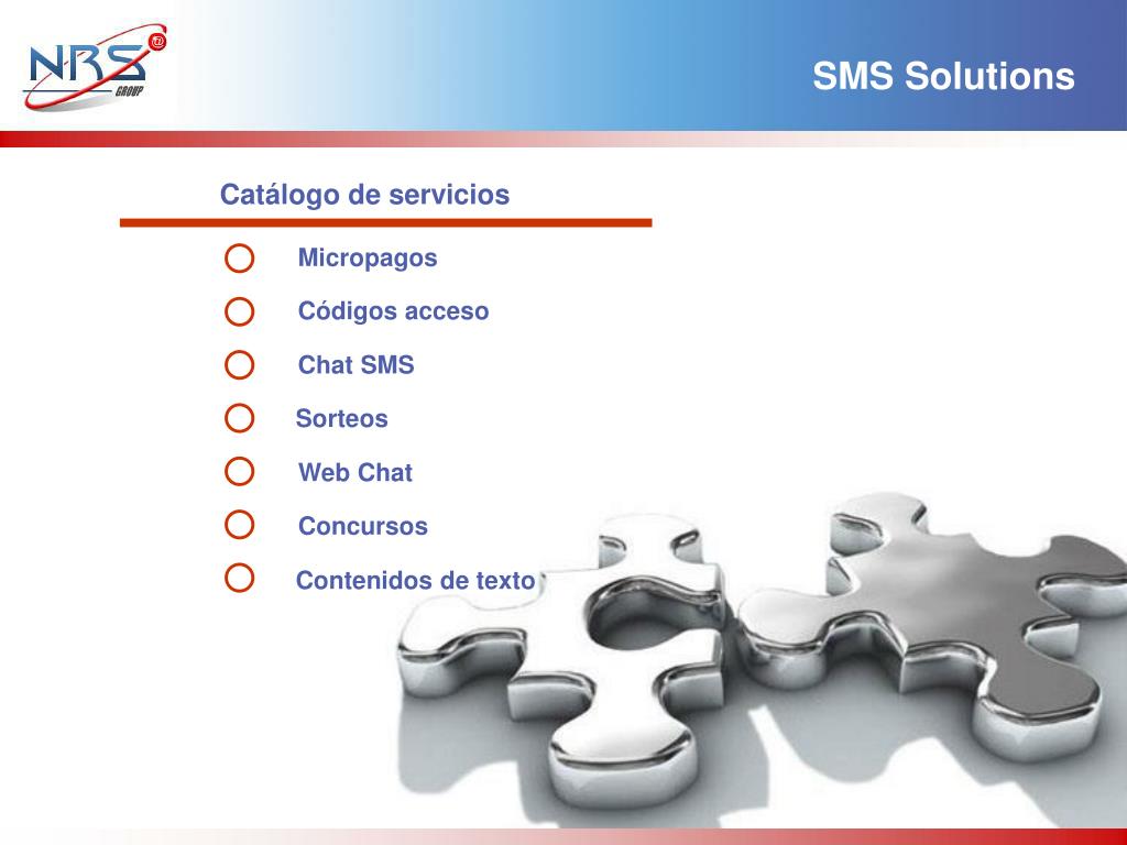 SMS Solutions Catálogo de servicios Micropagos Códigos acceso Chat SMS Sorteos Web Chat Concursos Contenidos de texto