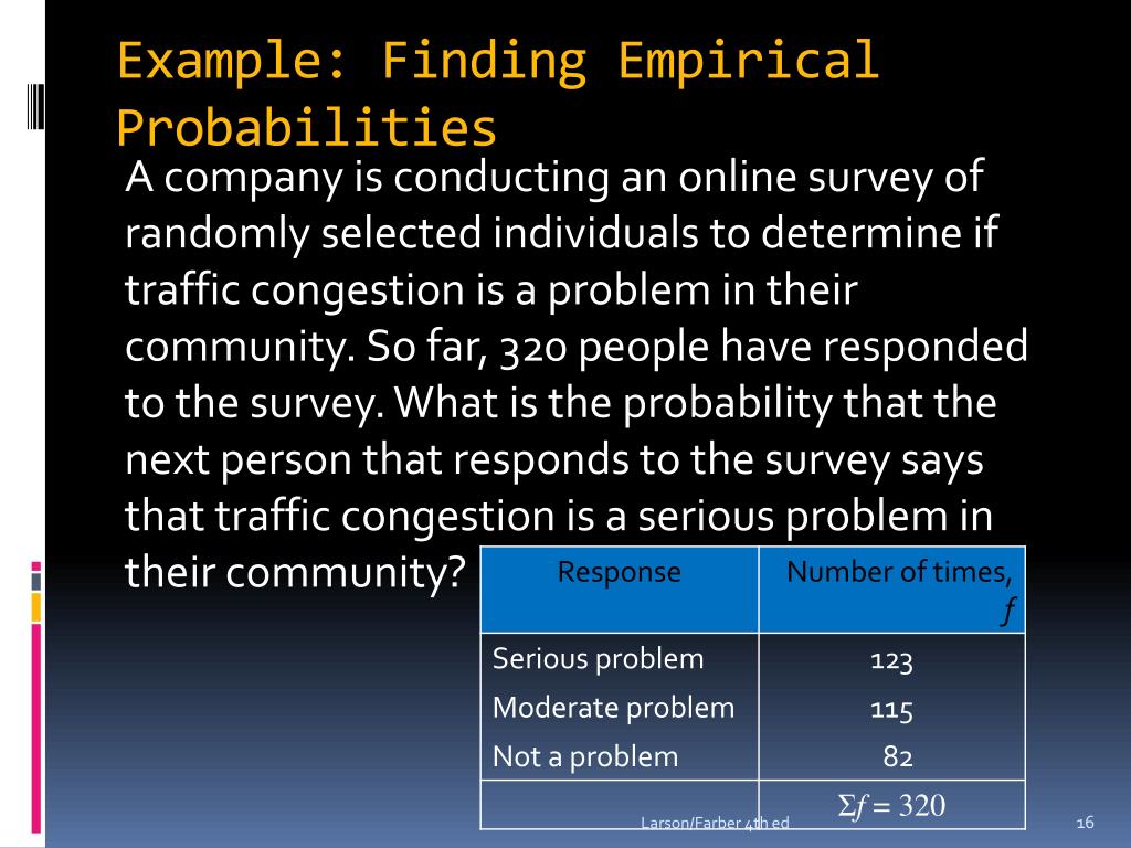 Example: Finding Empirical Probabilities A company is conducting an online survey of randomly selected individuals to determine if traffic congestion is a problem in their community. So far, 320 people have responded to the survey. What is the probability that the next person that responds to the survey says that traffic congestion is a serious problem in their community? Larson/Farber 4th ed