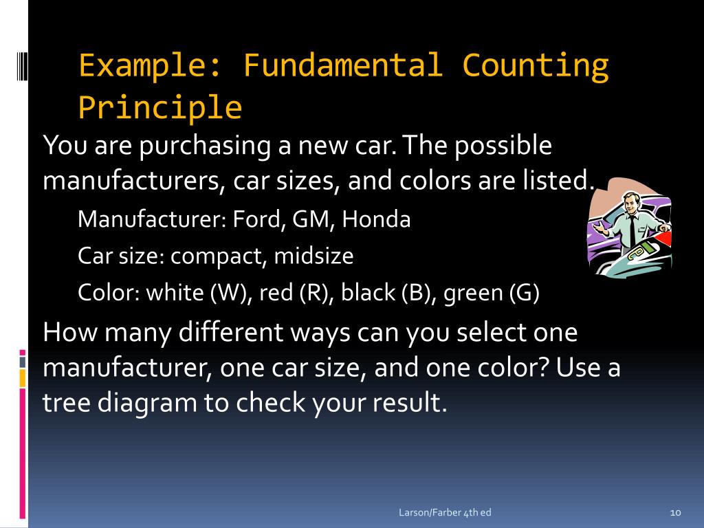 Solution: Fundamental Counting Principle There are three choices of manufacturers, two car sizes, and four colors. Using the Fundamental Counting Principle: 3 ∙ 2 ∙ 4 = 24 ways Larson/Farber 4th ed