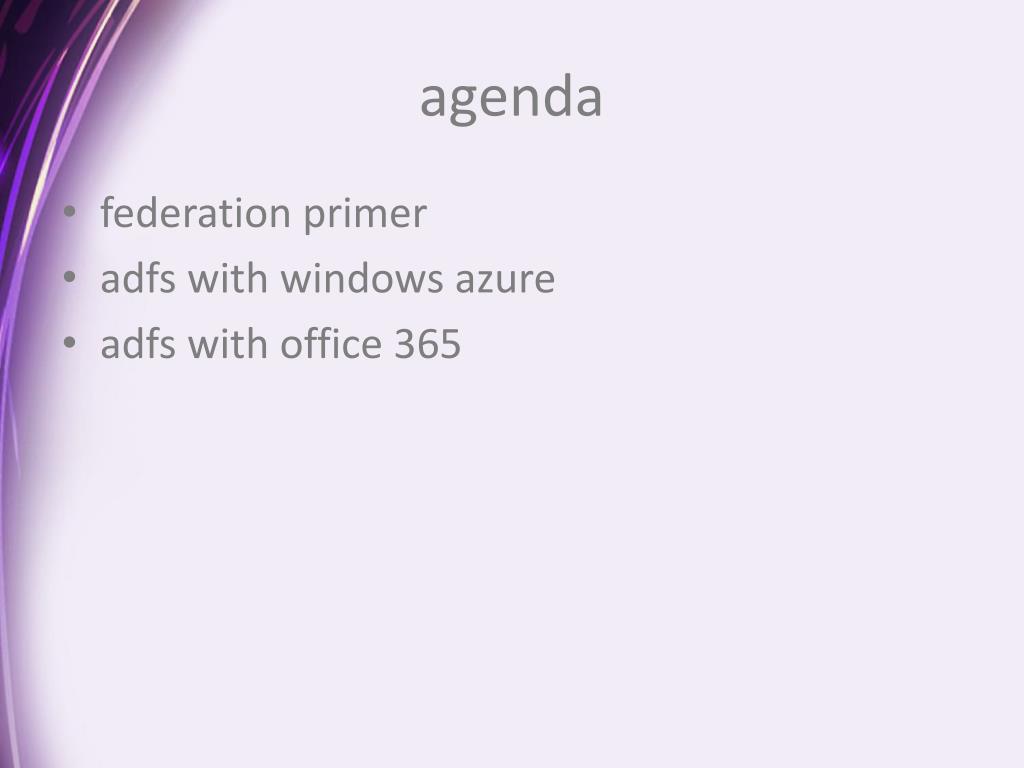 agenda • federation primer • adfs with windows azure • adfs with office 365