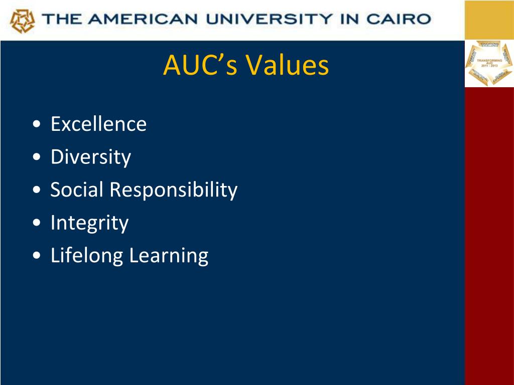 AUC’s Values • Excellence • Diversity • Social Responsibility • Integrity • Lifelong Learning