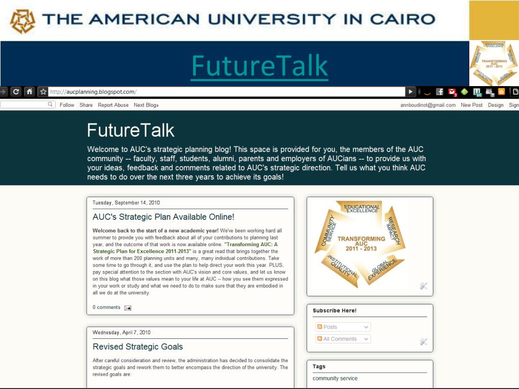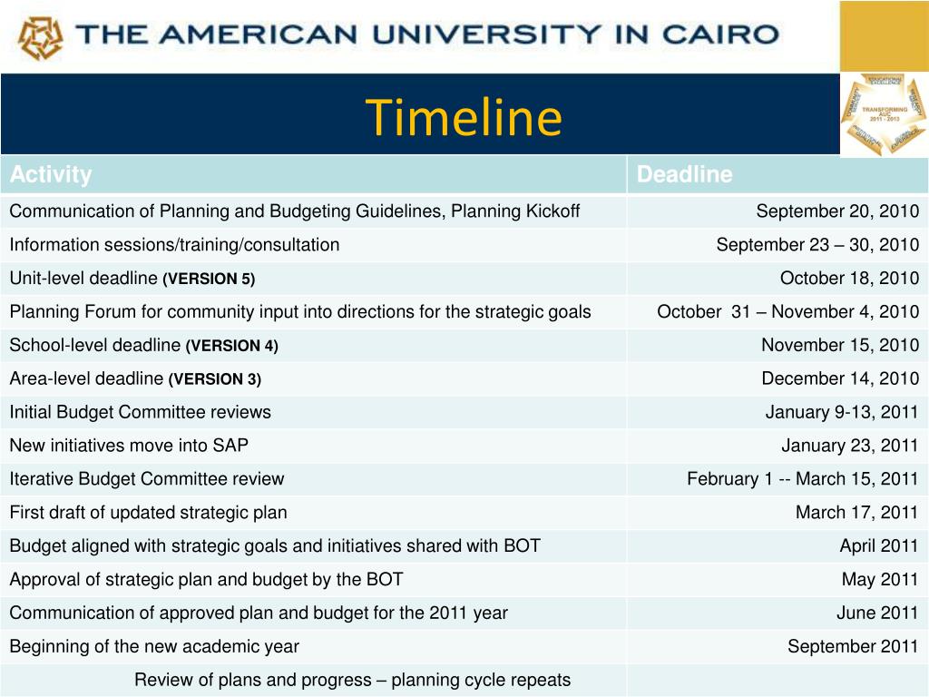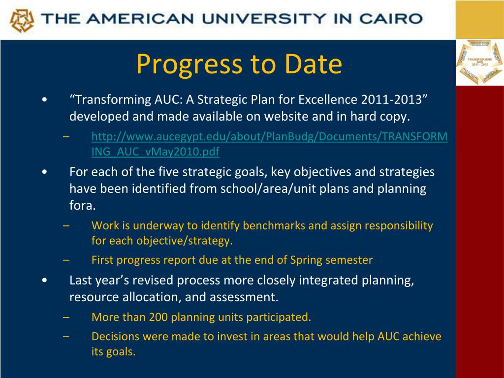 Progress to Date • “Transforming AUC: A Strategic Plan for Excellence 2011-2013” developed and made available on website and in hard copy. • http://www.aucegypt.edu/about/PlanBudg/Documents/TRANSFORMING_AUC_vMay2010.pdf • For each of the five strategic goals, key objectives and strategies have been identified from school/area/unit plans and planning fora. • Work is underway to identify benchmarks and assign responsibility for each objective/strategy. • First progress report due at the end of Spring semester • Last year’s revised process more closely integrated planning, resource allocation, and assessment. • More than 200 planning units participated. • Decisions were made to invest in areas that would help AUC achieve its goals.