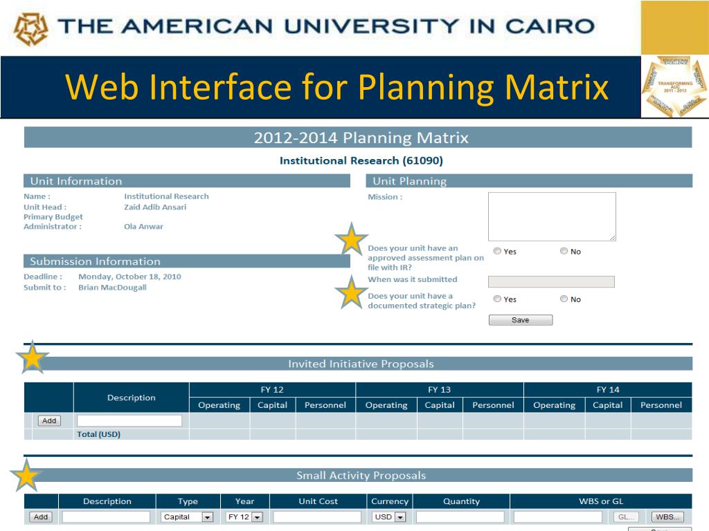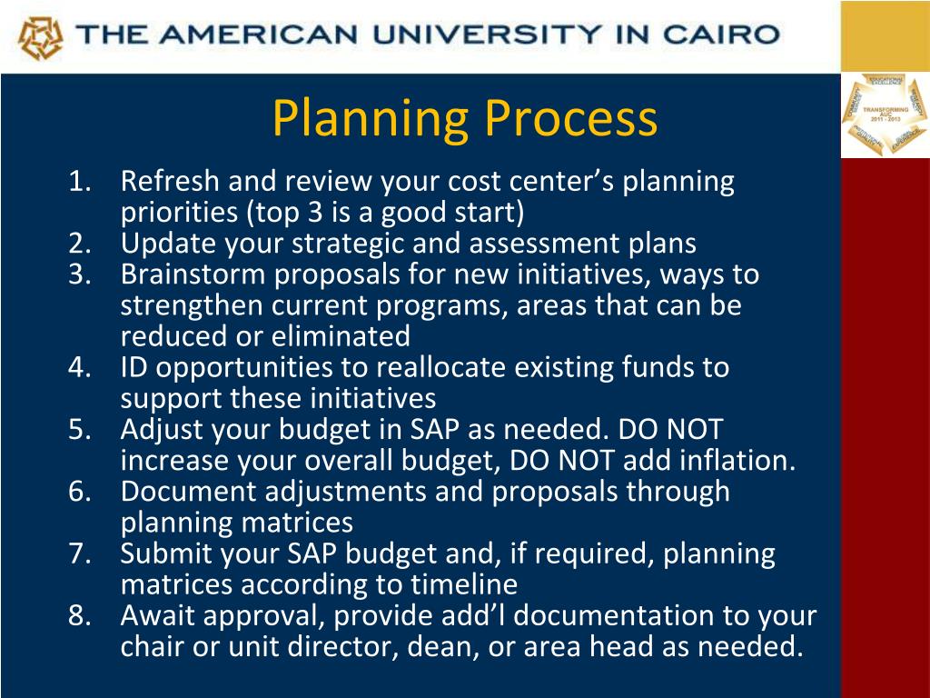 Planning Process: Setting Priorities 2. Invited Submissions • Can submit well-documented proposals for new allocations that further AUC’s strategic goals. • May request funds through planning matrix. • Must have strategic plan and assessment plan (on file with OIR) to be eligible. • Units invited to submit proposals: • Institutional Advancement • International student recruitment • Office of the Provost – faculty salaries and benefits • Human Resources – staff salaries and benefits • Office of Institutional Research • Office of the Core Curriculum • School of Global Affairs and Public Policy