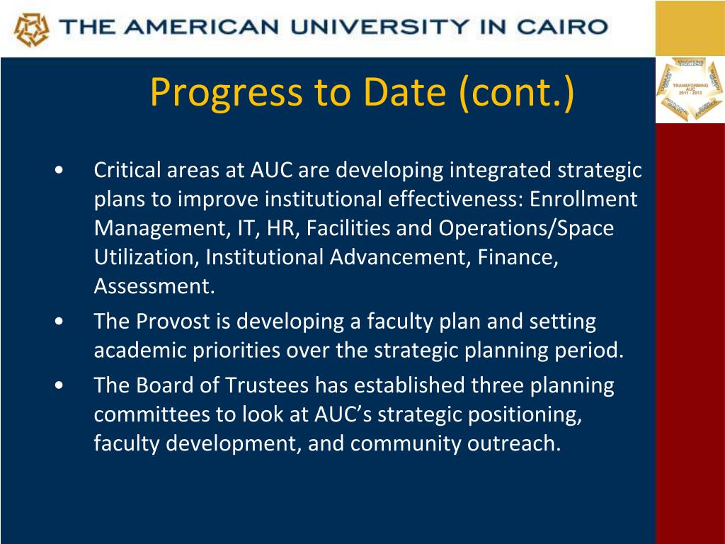 Progress to Date (cont.) • Critical areas at AUC are developing integrated strategic plans to improve institutional effectiveness: Enrollment Management, IT, HR, Facilities and Operations/Space Utilization, Institutional Advancement, Finance, Assessment. • The Provost is developing a faculty plan and setting academic priorities over the strategic planning period. • The Board of Trustees has established three planning committees to look at AUC’s strategic positioning, faculty development, and community outreach.
