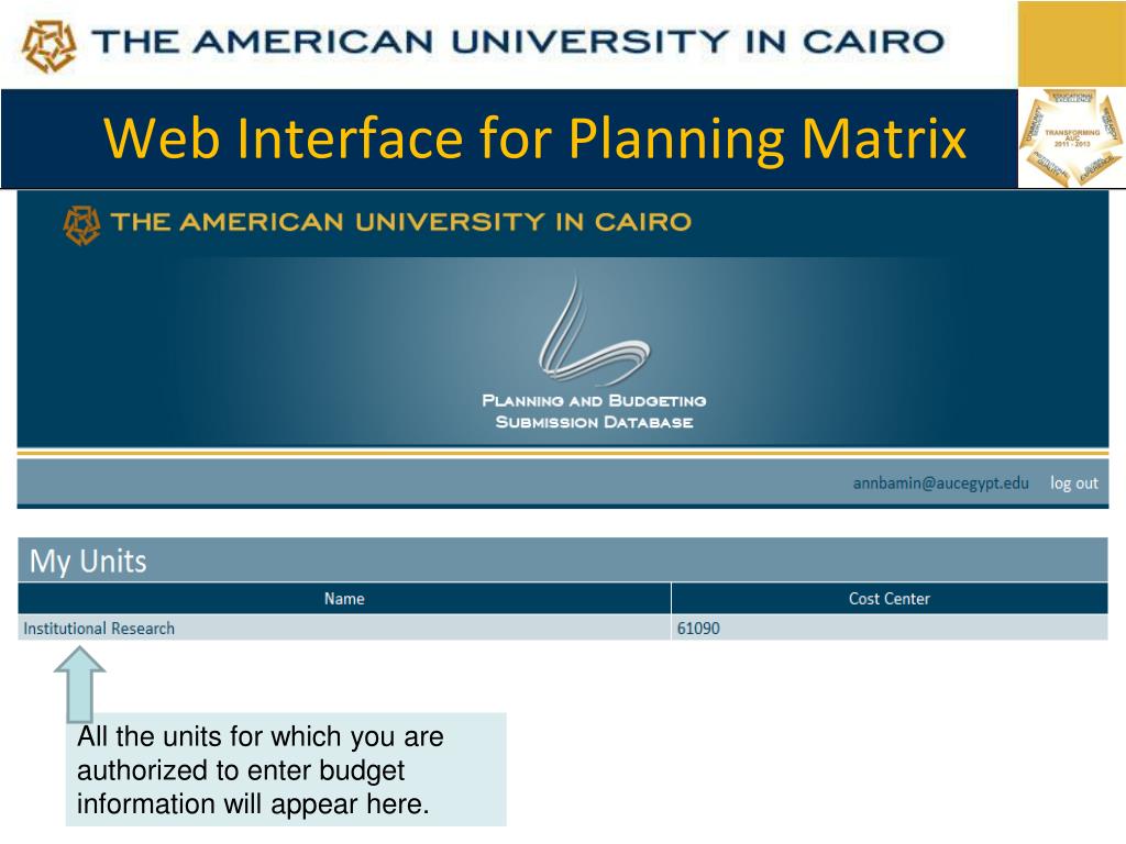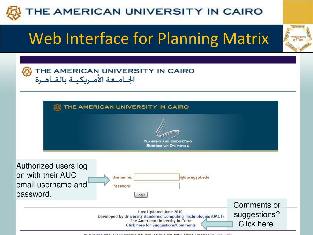 Web Interface for Planning Matrix Authorized users log on with their AUC email username and password. Comments or suggestions? Click here.