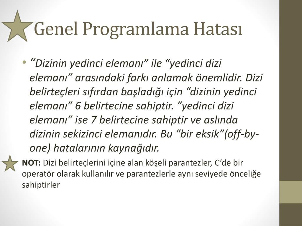 Genel Programlama Hatası • “Dizinin yedinci elemanı” ile “yedinci dizi elemanı” arasındaki farkı anlamak önemlidir. Dizi belirteçleri sıfırdan başladığı için “dizinin yedinci elemanı” 6 belirtecine sahiptir. ”yedinci dizi elemanı” ise 7 belirtecine sahiptir ve aslında dizinin sekizinci elemanıdır. Bu “bir eksik”(off-by-one) hatalarının kaynağıdır. NOT: Dizi belirteçlerini içine alan köşeli parantezler, C’de bir operatör olarak kullanılır ve parantezlerle aynı seviyede önceliğe sahiptirler