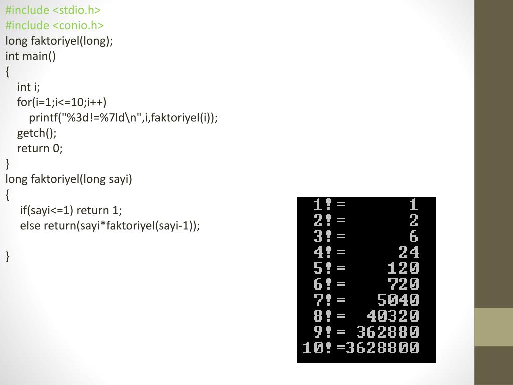 #include <stdio.h> #include <conio.h> long faktoriyel(long); int main() { inti; for(i=1;i<=10;i++) printf("%3d!=%7ld\n",i,faktoriyel(i)); getch(); return 0; } long faktoriyel(long sayi) { if(sayi<=1) return 1; else return(sayi*faktoriyel(sayi-1)); }