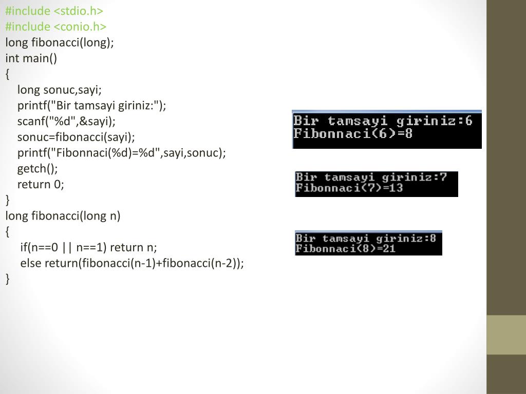 #include <stdio.h> #include <conio.h> long fibonacci(long); int main() { long sonuc,sayi; printf("Birtamsayigiriniz:"); scanf("%d",&sayi); sonuc=fibonacci(sayi); printf("Fibonnaci(%d)=%d",sayi,sonuc); getch(); return 0; } long fibonacci(long n) { if(n==0 || n==1) return n; else return(fibonacci(n-1)+fibonacci(n-2)); }