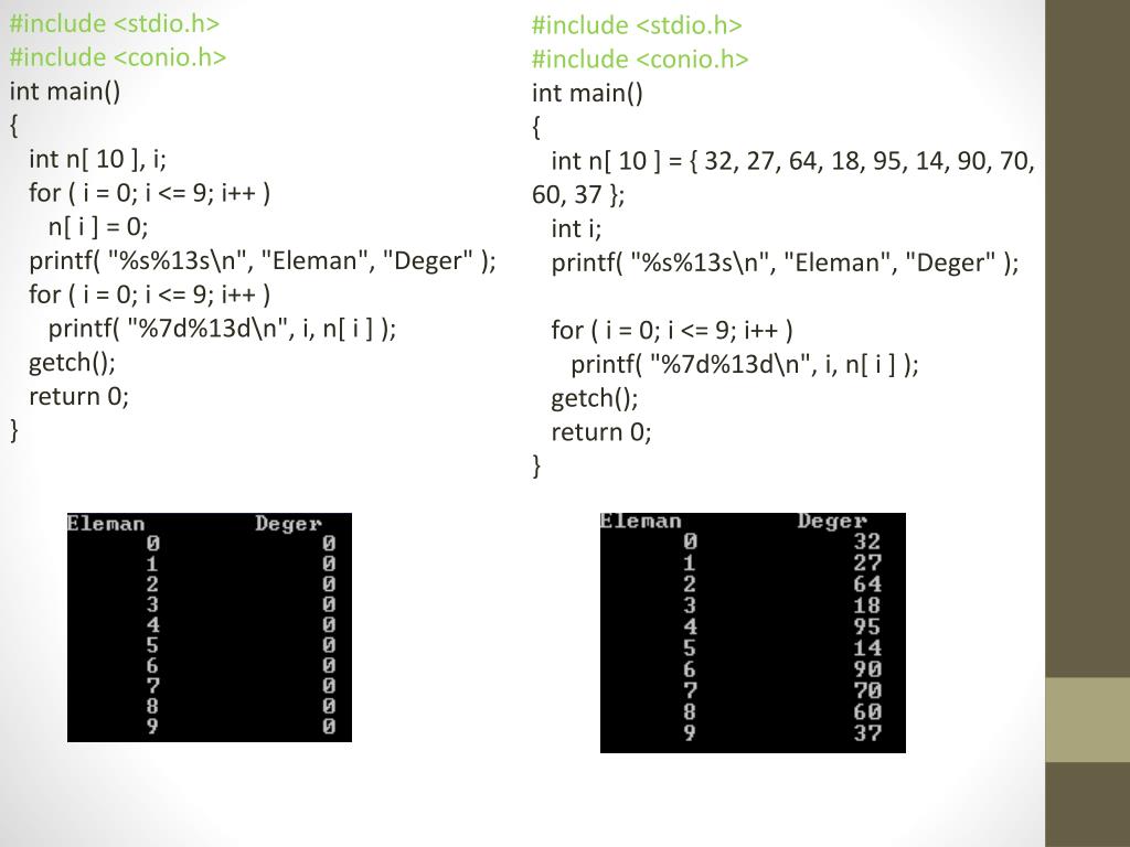 #include <stdio.h> #include <conio.h> int main() { int n[ 10 ], i; for ( i = 0; i <= 9; i++ ) n[ i ] = 0; printf( "%s%13s\n", "Eleman", "Deger" ); for ( i = 0; i <= 9; i++ ) printf( "%7d%13d\n", i, n[ i ] ); getch(); return 0; } #include <stdio.h> #include <conio.h> int main() { int n[ 10 ] = { 32, 27, 64, 18, 95, 14, 90, 70, 60, 37 }; inti; printf( "%s%13s\n", "Eleman", "Deger" ); for ( i = 0; i <= 9; i++ ) printf( "%7d%13d\n", i, n[ i ] ); getch(); return 0; }