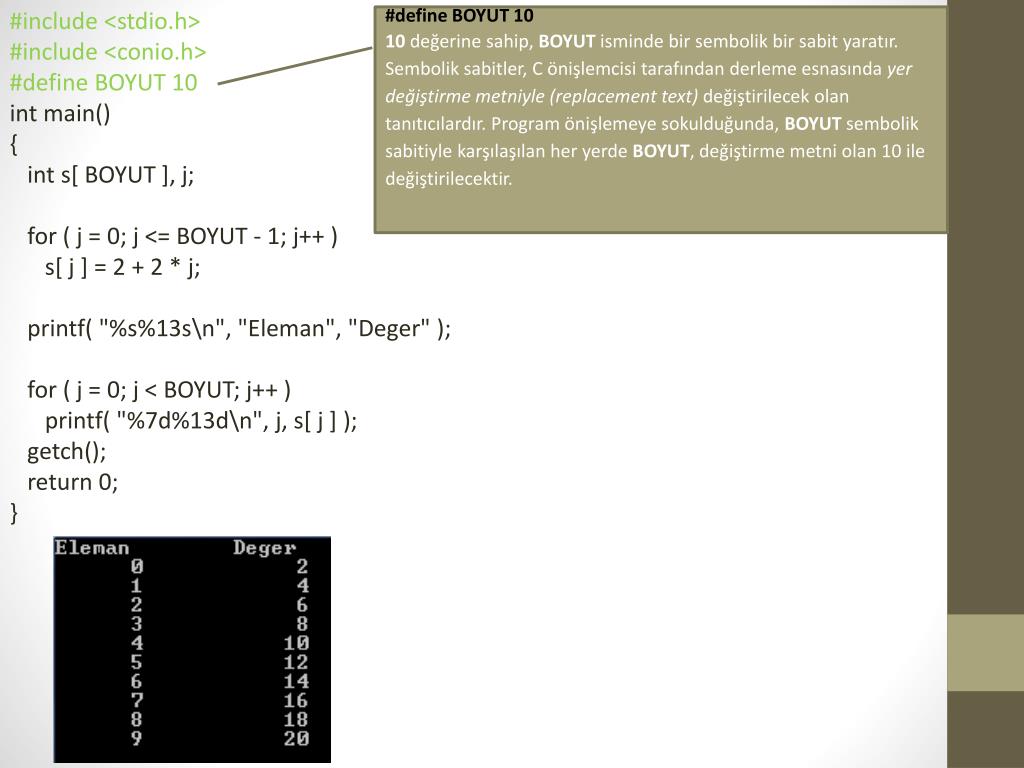 #include <stdio.h> #include <conio.h> #define BOYUT 10 int main() { int s[ BOYUT ], j; for ( j = 0; j <= BOYUT - 1; j++ ) s[ j ] = 2 + 2 * j; printf( "%s%13s\n", "Eleman", "Deger" ); for ( j = 0; j < BOYUT; j++ ) printf( "%7d%13d\n", j, s[ j ] ); getch(); return 0; } #define BOYUT 10 10 değerine sahip, BOYUT isminde bir sembolik bir sabit yaratır. Sembolik sabitler, C önişlemcisi tarafından derleme esnasında yer değiştirme metniyle (replacementtext) değiştirilecek olan tanıtıcılardır. Program önişlemeye sokulduğunda, BOYUT sembolik sabitiyle karşılaşılan her yerde BOYUT, değiştirme metni olan 10 ile değiştirilecektir.