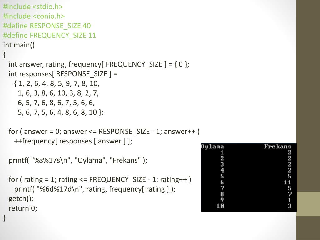 #include <stdio.h> #include <conio.h> #define RESPONSE_SIZE 40 #define FREQUENCY_SIZE 11 int main() { int answer, rating, frequency[ FREQUENCY_SIZE ] = { 0 }; int responses[ RESPONSE_SIZE ] = { 1, 2, 6, 4, 8, 5, 9, 7, 8, 10, 1, 6, 3, 8, 6, 10, 3, 8, 2, 7, 6, 5, 7, 6, 8, 6, 7, 5, 6, 6, 5, 6, 7, 5, 6, 4, 8, 6, 8, 10 }; for ( answer = 0; answer <= RESPONSE_SIZE - 1; answer++ ) ++frequency[ responses [ answer ] ]; printf( "%s%17s\n", "Oylama", "Frekans" ); for ( rating = 1; rating <= FREQUENCY_SIZE - 1; rating++ ) printf( "%6d%17d\n", rating, frequency[ rating ] ); getch(); return 0; }
