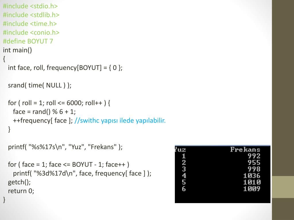 #include <stdio.h> #include <stdlib.h> #include <time.h> #include <conio.h> #define BOYUT 7 int main() { int face, roll, frequency[BOYUT] = { 0 }; srand( time( NULL ) ); for ( roll = 1; roll <= 6000; roll++ ) { face = rand() % 6 + 1; ++frequency[ face ]; //swithcyapısıiledeyapılabilir. } printf( "%s%17s\n", "Yuz", "Frekans" ); for ( face = 1; face <= BOYUT - 1; face++ ) printf( "%3d%17d\n", face, frequency[ face ] ); getch(); return 0; }