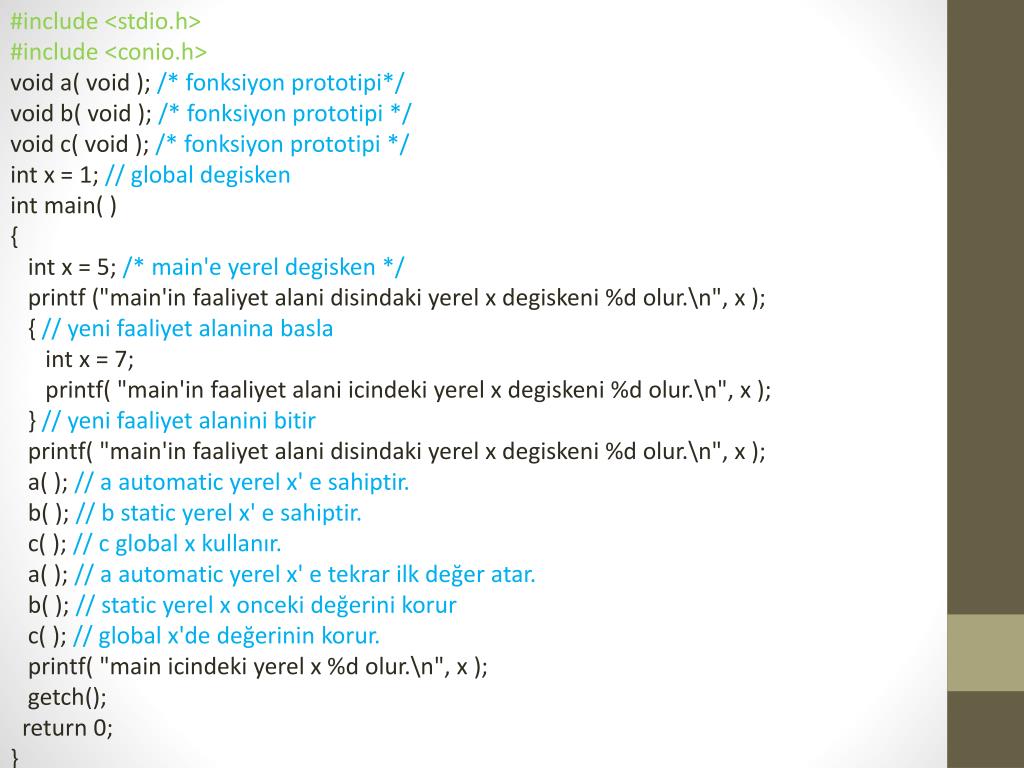 #include <stdio.h> #include <conio.h> void a( void ); /* fonksiyonprototipi*/ void b( void ); /* fonksiyonprototipi */ void c( void ); /* fonksiyonprototipi */ int x = 1; // global degisken int main( ) { intx = 5; /* main'eyereldegisken */ printf("main'infaaliyetalanidisindakiyerel x degiskeni %d olur.\n", x ); { // yenifaaliyetalaninabasla intx = 7; printf( "main'infaaliyetalaniicindekiyerel x degiskeni %d olur.\n", x ); } // yenifaaliyetalaninibitir printf( "main'infaaliyetalanidisindakiyerel x degiskeni %d olur.\n", x ); a( ); // a automatic yerel x' e sahiptir. b( ); // b static yerel x' e sahiptir. c( ); // c global x kullanır. a( ); // a automatic yerel x' e tekrar ilk değeratar. b( ); // static yerel x oncekideğerinikorur c( ); // global x'dedeğerininkorur. printf( "main icindekiyerel x %d olur.\n", x ); getch(); return 0; }