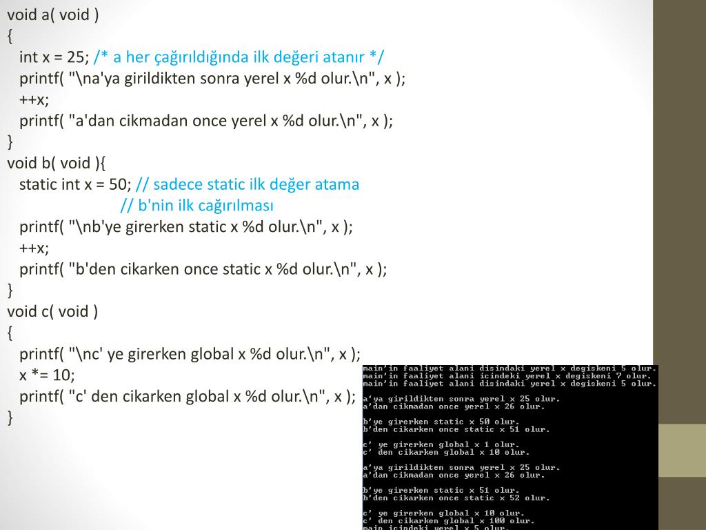 void a( void ) { intx = 25; /* a her çağırıldığında ilk değeriatanır */ printf( "\na'yagirildiktensonrayerel x %d olur.\n", x ); ++x; printf( "a'dancikmadan once yerel x %d olur.\n", x ); } void b( void ){ static int x = 50; // sadece static ilk değeratama // b'nin ilk cağırılması printf( "\nb'yegirerken static x %d olur.\n", x ); ++x; printf( "b'dencikarken once static x %d olur.\n", x ); } void c( void ) { printf( "\nc' ye girerken global x %d olur.\n", x ); x *= 10; printf( "c' den cikarken global x %d olur.\n", x ); }