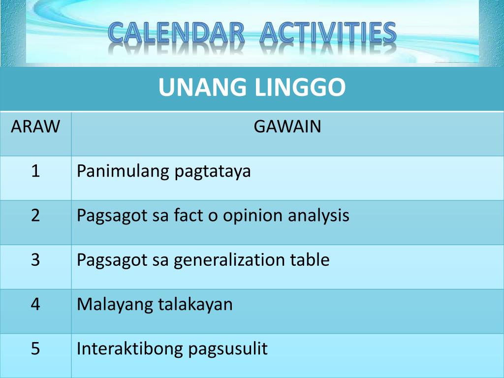 Targeted Content Standards • Napauunladangkasanayansapag-unawasadiskursongpinakinggan • Napalalalimangpag-unawasatekstongbinasasapamamagitan ng pagsusurisanilalamannito • Nakagagawa ng mgagawaingmagpapatunaysamapanuringpagbasa ng teksto • Naisasaalang-alangangmgakasanayansapaggamit ng Filipino sapagsulat ng talata