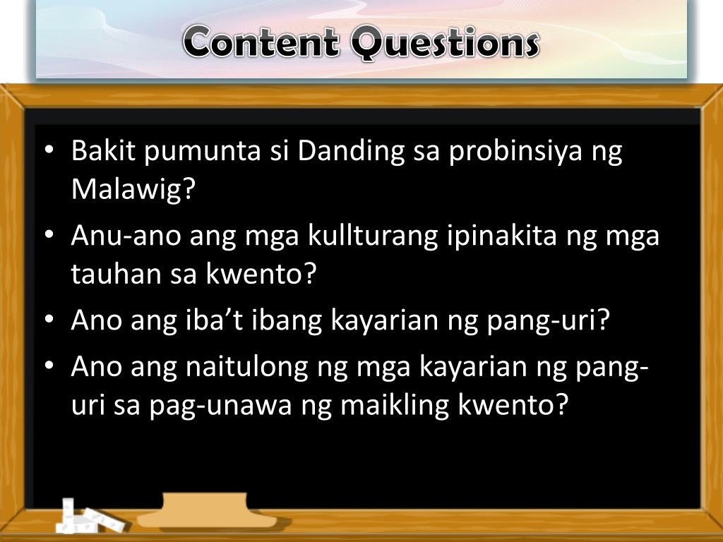 Content Questions • BakitpumuntasiDandingsaprobinsiya ng Malawig? • Anu-anoangmgakullturangipinakita ng mgatauhansakwento? • Anoangiba’tibangkayarian ng pang-uri? • Anoangnaitulong ng mgakayarian ng pang-urisapag-unawa ng maiklingkwento?