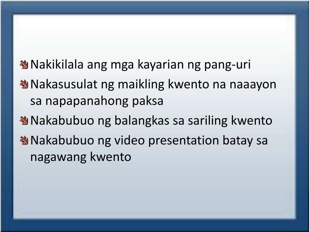 Nakikilalaangmgakayarian ng pang-uri • Nakasusulat ng maiklingkwentonanaaayonsanapapanahongpaksa • Nakabubuo ng balangkassasarilingkwento • Nakabubuo ng video presentation bataysanagawangkwento